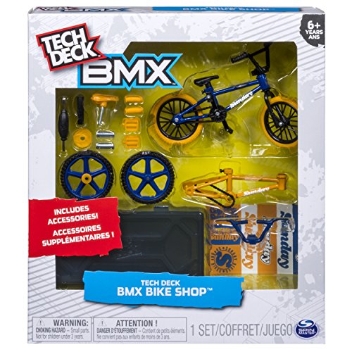 Studio : Spin Master Publisher : Spin Master Binding : Toy Product Description Tech Deck brings you the best in replica miniaturized BMX bikes with the BMX Bike Shop! The Bike Shop includes everything you need to build two custom BMX bikes with accessories such as wheels, grips, pegs, tools, stickers and more! You can even store all your bike parts in the included storage container while you perfect your tricks. Use the trick handlebars to easily pull off tail whips, flips, and more! With replica metal frames and graphics from some of the top brands in the BMX industry, Tech Deck gives you superior performance and realistic details you can't find anywhere else. The most authentic miniaturized bikes come from Tech Deck! Real bikes. Unreal Tricks. 0