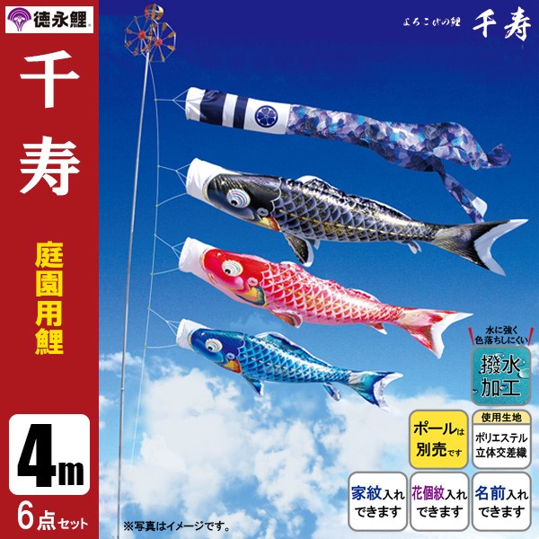こいのぼり/鯉のぼり 庭園用(ポール別売りになります)(家紋入れ・名前入りは別料金になります)鯉のぼり 室内用 鯉のぼり ポール 鯉のぼり マンション 鯉のぼり 庭 園用 鯉のぼり 手作り 久月鯉のぼり 鯉のぼり ポール 鯉のぼり 徳永 取扱(セット内容)・吹流し4m・黒鯉4m・赤鯉3m・青鯉2m・矢車一式・ロープ20mよろこびの鯉 千寿 "よろこびの鯉 千寿は、立体交差織のポリエステル生地を使用し、太陽光線を浴びると白銀色に輝く特殊加工が施されています。鯉のぼりの色は鮮やかな色調の上にアルミ金箔をちらし、華やかさを演出しています。吹流しには、繊細な線で描かれた波柄を青系の色づかいで構成し、落ち着いたデザインが鯉のぼりを引き立てます。また、鯉のぼり・吹流し共に雨水に強い撥水加工こ高級鯉のぼりです。