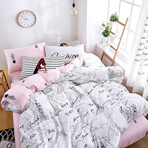 BuLuTu Paris Eiffel Tower Cotton Duvet Cover Sets Queen White Pink For Girls(1 Duvet Cover and 2 Pillowcases) Reversible Cactus Print Kids Bedding Sets Full Zipper Closure Wholesale