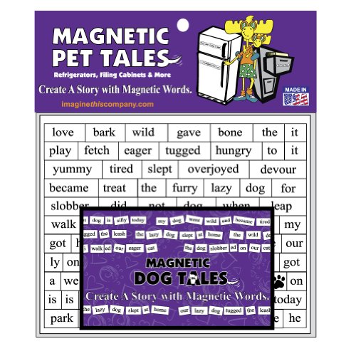 -. Binding : Misc. -. Brand : Imagine This -. Department : Assorted Dogs -. EAN : 0729173972005 -. Feature : 72 words in all / Magnetic pieces stick to any metal surfaces / Easily removable and changeable for endlessly creative possibilities -. Label : Imagine This Company -. Manufacturer : Imagine This Company -. Model : Q7200 -. MPN : Q7200 -. PackageQuantity : 1 -. PartNumber : Q7200 -. ProductGroup : Pet Products -. ProductTypeName : PET_SUPPLIES -. Publisher : Imagine This Company -. Studio : Imagine This Company -. Title : Imagine This Magnetic Pet Tales, Dog Tales -. UPC : 729173972005