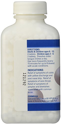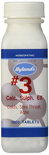 Hyland's Cell Salts #3 Calcarea Sulphurica 6X Tablets, Natural Homeopathic Relief of Colds, Sore Throat, Acne, 1000 Count Colds, sore throat, acne NATURAL REMEDIES SINCE 1903? Hyland’s has been producing homeopathic medicines since 1903. Made with natural ingredients and made in the United States. Hyland’s products contain no artificial flavors, dyes or parabens. This product works to stimulate the body’s own natural healing process. FDA COMPLIANT MANUFACURING Always read and follow the label directions when using Hyland's products. The uses for our products are based on traditional homeopathic practice. Hyland’s products follow the manufacturing and quality practices outlined in the Homeopathic Pharmacopoeia of the United States. Hyland’s operates in full compliance with the FDA standards for manufacturing, safety and labeling. Hyland's products have not been reviewed by the Food and Drug Administration. All ingredients are tested upon receipt to ensure potency and safety. Hyland’s Facilities use the most up-to-date equipment and environment to guarantee purity and quality. SAFE AND RELIABLE Homeopathy is a safe effective system of medicine with fundamental principles for selection, application and manufacture. Homeopathy’s potency preparations (6X, 30X, 30C) make dosing safe and stimulating to the body’s own healing properties. Hyland’s quick-dissolving sublingual tablets are safe, effective and completely free of Aspirin, Acetaminophen or Ibuprofen. Homeopathic preparations dilute and invigorate the source, making doses non-toxic and safe to take alongside other medications without contraindications or known side effects. 0 |