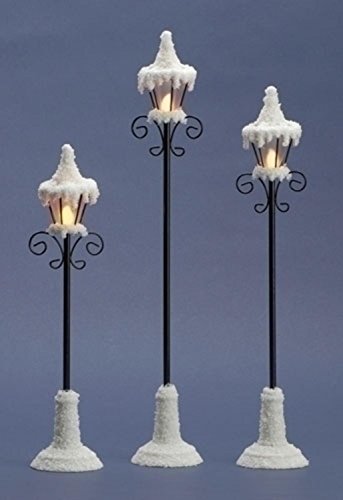 Set of 3 Christmas Village Lamp Posts Item #36153 Frosted and glittered thin lamp posts with scroll design and flickering light Each lamp post requires (3) button cell AG 13 batteries - included Convenient on/off switch on the bottom Dimensions of lamp posts: Small: 11.75"H x 2.5"W Medium: 13.75"H x 2.5"W Large: 16"H x 2.5"W Material(s): plastic 0