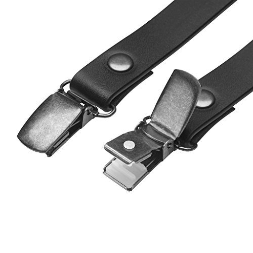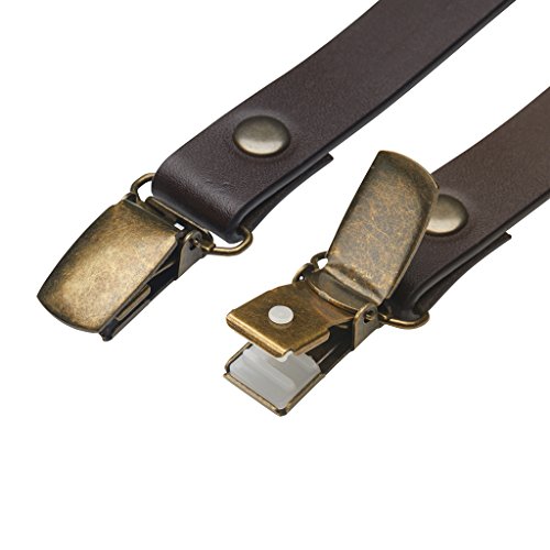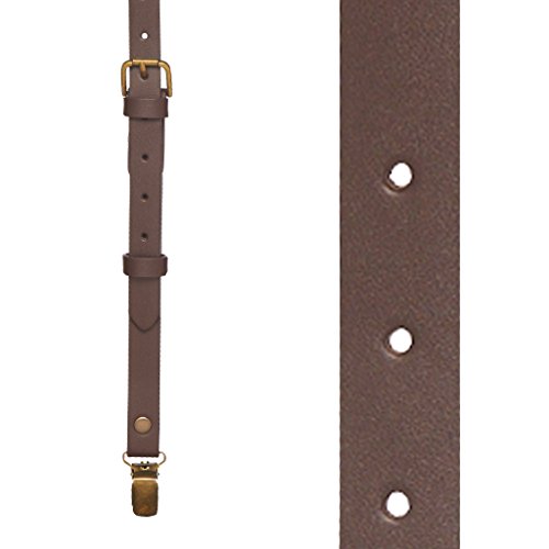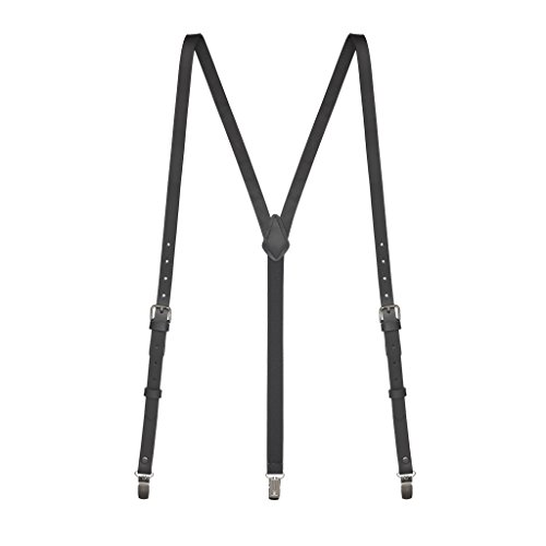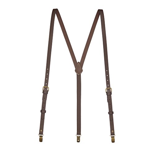 Binding : Apparel Product Description The perfect suspenders for just about any attire! Our high-quality leather suspenders are made from smooth, 5/8-inch wide leather, perfect for wearing with denims, work pants or khakis. The design is classic with a Y-back design and leather crosspatch, a small amount of elastic below the Y for just the right amount of give. Finished with metal dropclips and buckle length adjusters for the perfect fit. We offer these in black and brown and they are available in 3 sizes. 0