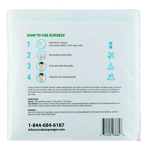 SCRUBZZ Rinse Free Bath Shower Sponge is a life changing product that will transform your bathing experience. This convenient and easy to use bathing sponge features a unique design that lets you bathe quickly and easily even when you don't have a shower, soap ormore than 3 oz of water!! In short, Scrubzz gives you the complete shower experience without the need of much water!