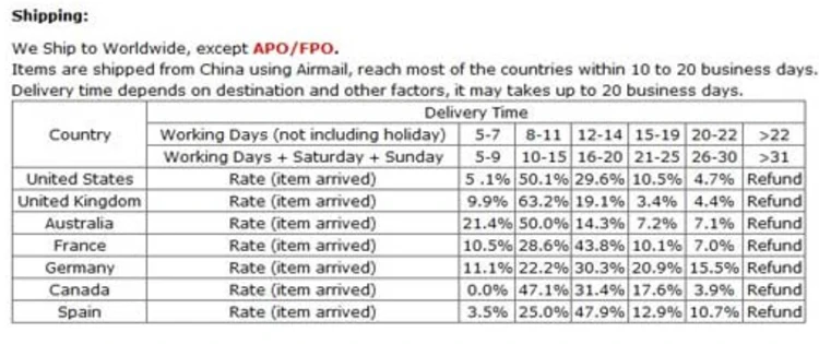 Attention, Please! we are international seller from China mainland. PLEASE BE PATIENT! We offer by China Post Air Mail. The average arrival time is 20 - 30 days as follows. If you are very urgent with the order, welcome to contact us for fast express such as DHL/UPS/FEDEX. If you have any question or any special request, do please contact us. we will reply in 24 hours due to the time difference between us.