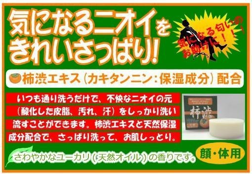 | 柿渋エキス(カキタンニン)と天然保湿成分を配合。汗や汚れもしっかり洗い流す、さっぱりタイプの石鹸です。さわやかなユーカリ(天然オイル)の香り♪ |