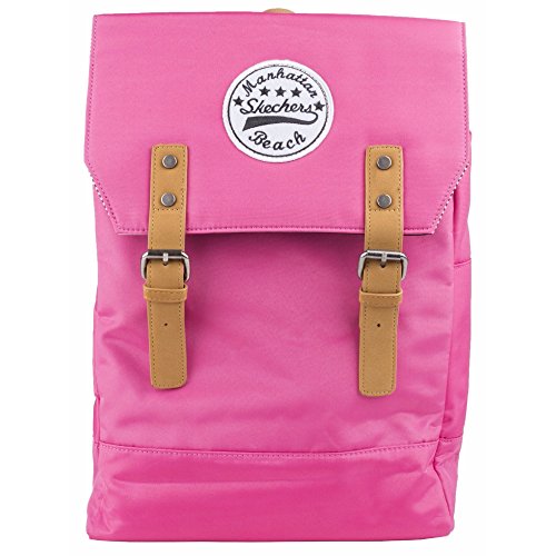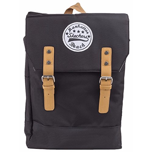 Product Description Unisex backpack. Magentic and buckle closure for main compartment. Inside hanging zipper pocket. Inside computer tablet pocket. Adjustable shoulder straps. Skechers signature embroidery logo patch. Plastic buckle with S logo. Fabric: Microfiber with polycotton lining. Dimensions: 14.5in x 10.6in x 3.9in. 0