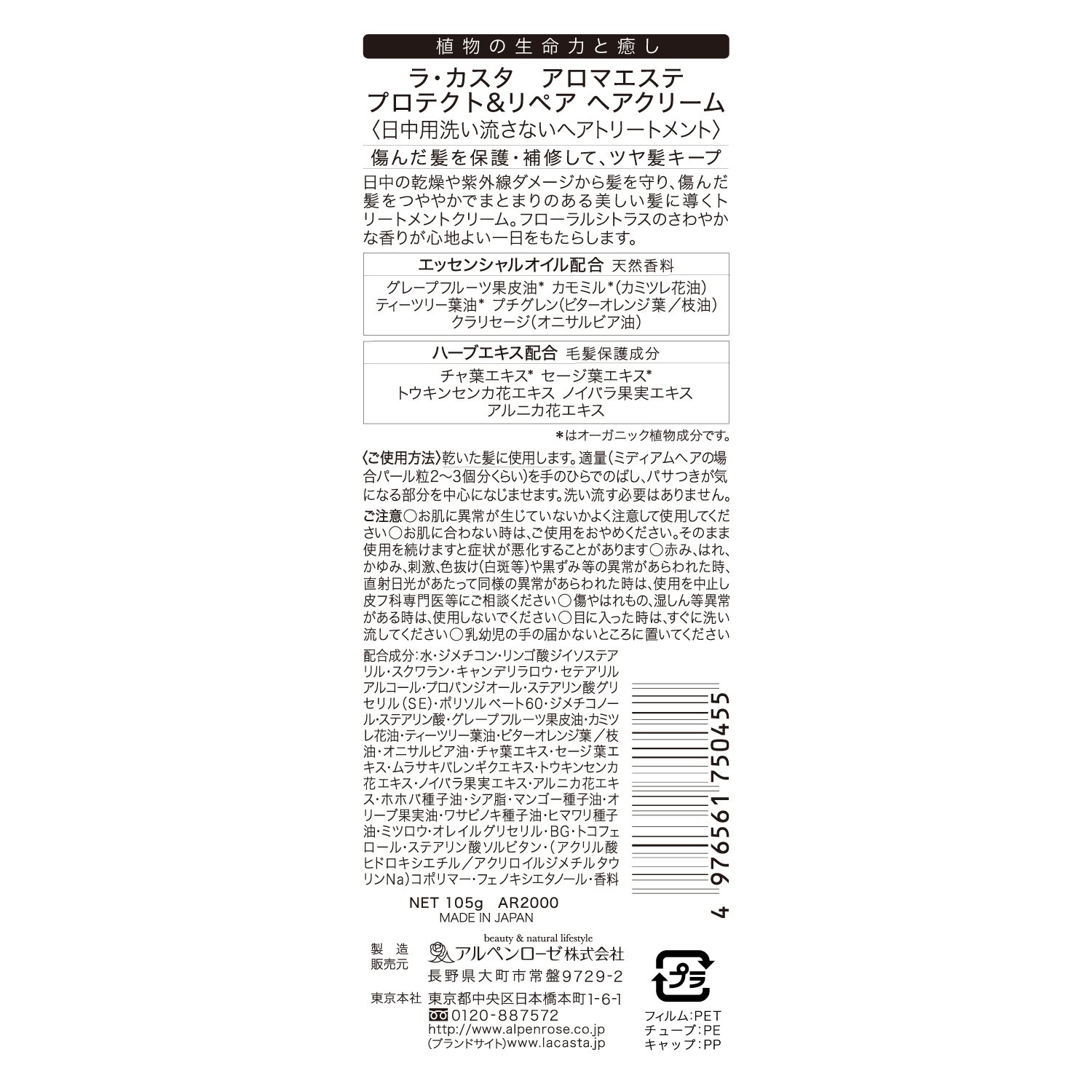 Treatment cream that protects hair from various damage such as drying, ultraviolet rays, static electricity and so on during the day and from external stress and arranges it with beautiful gloss and cohesive hair.