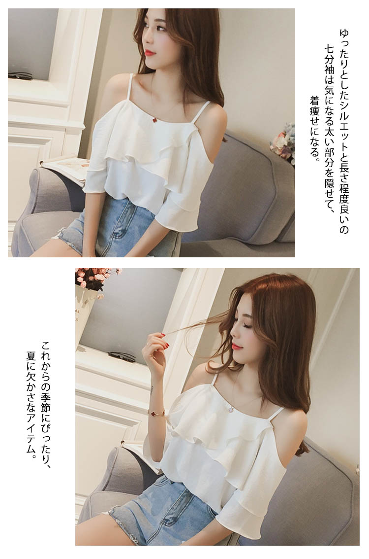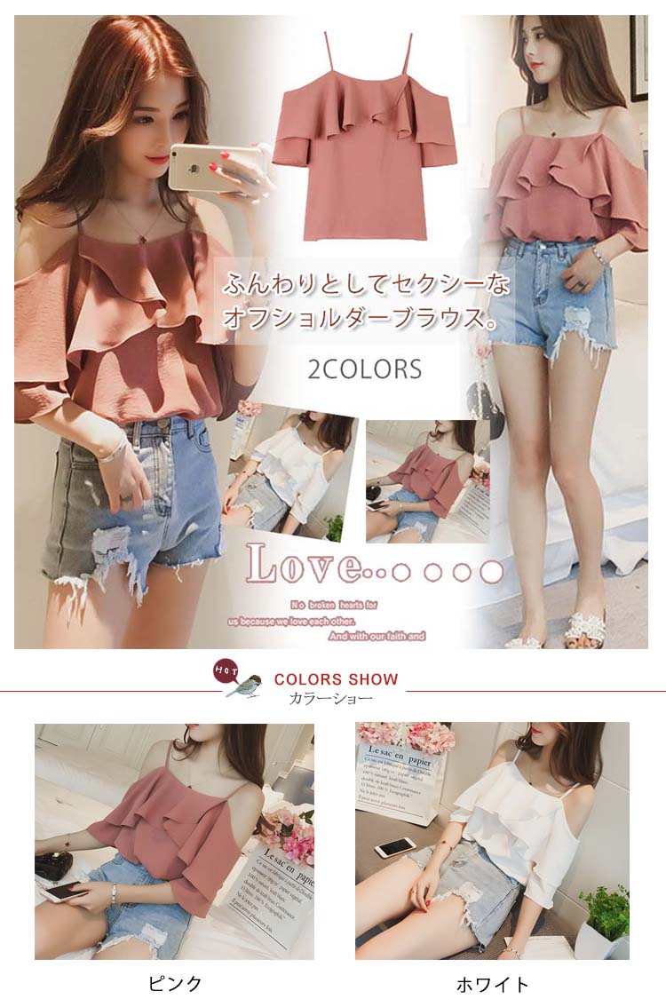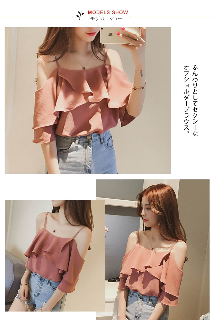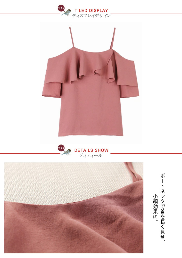 | ふんわりとしてセクシーなオフショルダーブラウス。オフショルダーで綺麗な鎖骨が見え、重ねなスカラップで、シンデレラバストでもセクシーなフェミニンが演出できる。ゆったりとしたシルエットと長さ程度良いの七分袖は気になる太い部分を隠せて、着痩せになる。これからの季節にぴったり、夏に欠かさなアイテム。 | |