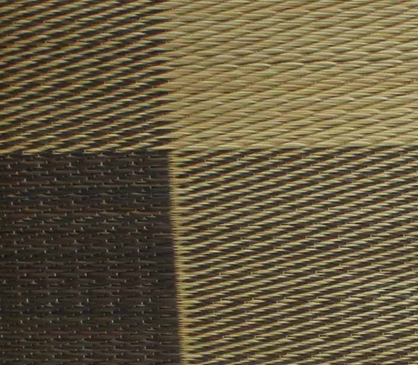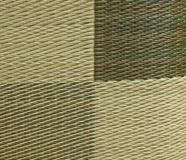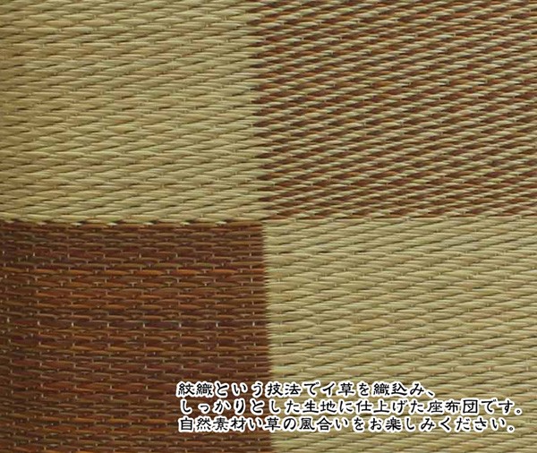 側地は紋織という技法で仕上げております。一般的な敷き物と同じようにイ草を織込み、しっかりとした生地に仕上げました。国産(九州産)のい草を使用しています。一本一本が太く、表皮が厚く繊維がキメ細かいので弾力性があり、耐久性に優れています。い草には空気の自然浄化作用、湿度の調節作用などがあります。また汚れにくく、使用するうちに黄金色に変化し味が出ます。い草に青森ヒバ加工を施しています(抗菌、防臭効果)。中材はウレタンをフェルトでサンドした三層構造で、適度なクッション性があります。