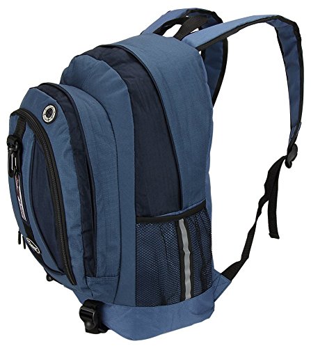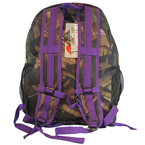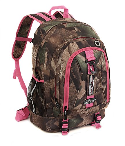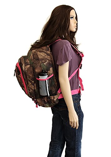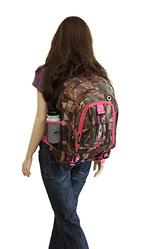 -. Feature : Material: 600D Polyester for daily durable use. Available in Hunters Camo/Pink, Multi Camo, Hunters Camo, Black, Black/Royal Blue, Red/Charcoal and Digital Camo / Excellent storage: Dual zipper front pocket with organizer (1 mesh pocket, 2 pen/marker slots, 1 open pocket), 2 side mesh pockets with reflective stripe, 1 dual zipper compartment, 1 zippered main compartment / Music Audio port in front pocket: feed your headphone cable through the port to listen to your favorite music while wearing the backpack / Comfortable fit: adjustable padded shoulder strap, chest and waist strap (only on Black, ACU, Navy Camo, Hunters Camo, and Pink Hunters Camo) all with buckle snaps for a perfect stabilized fit / Dimensions: 19.5"L x 13.5"W x 8"D; Volume: 2100 cu. in.