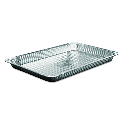 The Handi-Foil 402170 full-size shallow steam table pan is made of aluminum, is disposable, has a curled rim, and can be carried to a steam table and used to hold and serve food. Aluminum weighs less than steel, can support hot or cold foods, and can be recycled. The curled rim provides rigidity and can be held or gripped. The top of the steam table pan measures 20-3/4 x 12-3/4 inches on the outside (L x W) and 19-5/8 x 11-3/4 inches on the inside. (L is length, the horizontal distance from front to back; W is width, the horizontal distance from left to right.) The bottom measures 18-5/8 x 10-3/4 inches. The pan has a vertical depth of 1-5/8" and a capacity of 176 oz.