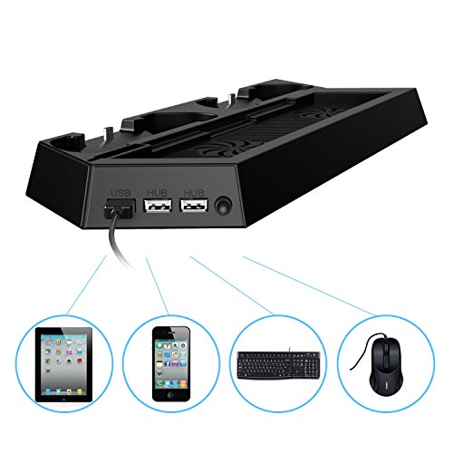 Kootek Kootek PS4 Vertical Stand with Cooling Fan Charger Multifunctional PlayStation 4 Console Cooler Dualshock 4 Controllers Charging Station with Dual Charger Ports and USB HUB