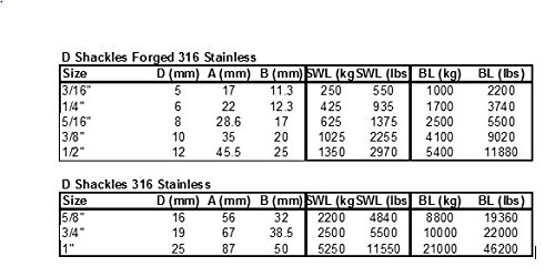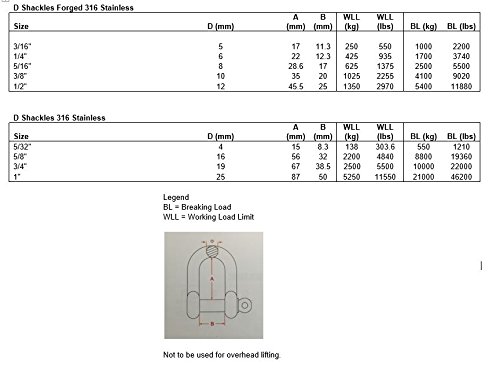 Studio : US Stainless Publisher : US Stainless Binding : Misc. Product Description This is for one (1) quality marine grade stainless steel (AISI 316) D shackle. Each shackle is stamped 316 and laser etched with the size. The shackles are marked in the US specification style. This is a 5/8" cast shackle. Not to be used for overhead lifting. AISI 316 stainless is a premium grade of stainless and is considered by many to be best in class. 316 stainless is corrosion resistant and very durable even in the harshest of conditions. 0