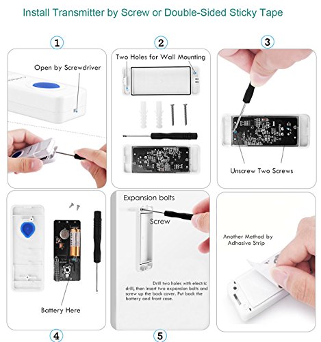 ULTRA EASY INSTALLATION: No batteries required for receiver, simply plug it into a power supply (US Standard); Mount transmitter with double-sided adhesive tape or anchors & screws included. And the ring tone can be set different for each transmitter button.