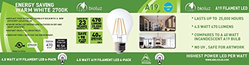 Bioluz LED Vintage 40 Watt Light Bulb, Edison Style Filament LED, Dimmable A19, Uses 4.5 Watts, Warm White (2700K) Clear Pendent Light Bulb UL Listed (Pack of 6)