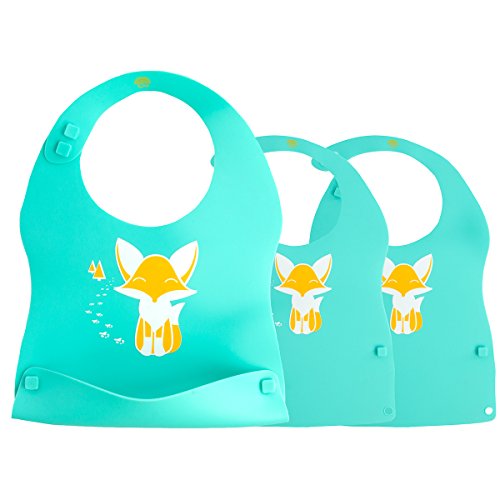 -. Feature : Baby crumb catcher bib - snap pouch design traps food during mealtime; unsnaps, easily wipes clean & keeps dry; Baby bib features contoured sides for little arms to grasp food; Comfortable & adjustable neck strap, won't irritate baby's skin / Dishwasher safe, stain resistant, waterproof; Food safe, food-grade silicone, safety tested, toxin free, hypoallergenic, antibacterial, anti-microbial, BPA free; Baby baby drool bibs or burp bibs - Soft & flexible enough for drooling & teething babies, can also be used as baby burping bibs for newborns; Lightweight, sustainable, packable, durable; Roll up bib - easily folds for convenient storage, portable for travel / Cute unisex, neutral styles - bright colors, cute animal patterns, zero waste; Choose purple hedgehog or teal fox design; Silicone baby bibs set is perfect baby shower, registry gift, must haves for new parents, Christmas or holiday present; Bulk lot food catcher bibs made in China / Baby bibs for toddlers fits infants/toddlers 6-36 months; 10.5"L x 6.5"W; Neck adjusts: 9.5"C to 11"C / (3) Little Bites Silicone Bibs by Kinderville Jr., New In Individual Retail Packaging