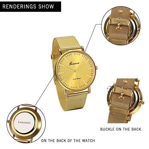 Brand, Seller, or Collection Name:Lancardo Part Number:LCD100955 Model Year:2017 Item Shape:Round Dial window material type:Glass Display Type:Analog Clasp:Hook Buckle Case material:Metal Case diameter:1.60 inches Case Thickness:0.30 Band Material:Gold-tone stainless steel Band length:Unisex Band width:0.70 inches Band Color:Gold Dial color:Gold Bezel material:Stainless steel Special features:stainless steel band Item weight:1.60 Ounces Movement:Japanese quartz Water resistant depth:30 Meters
