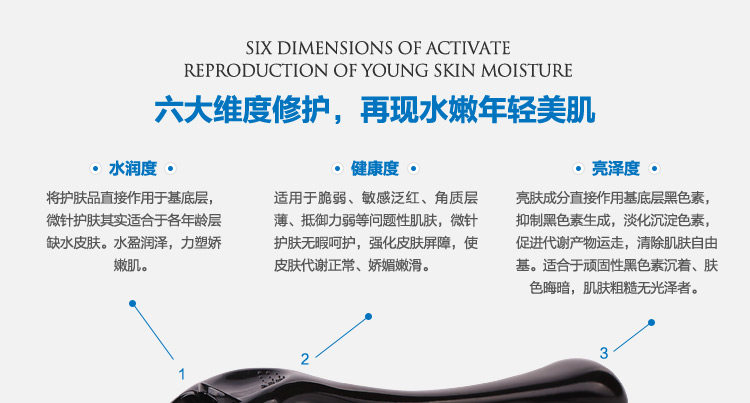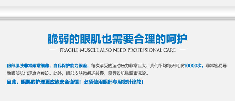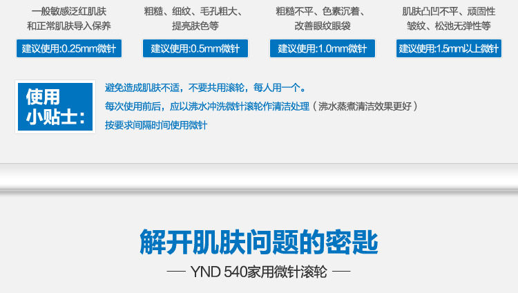 微针选择:手柄只是颜色区别,表皮正常保养按摩用到0.25或0.5针;正常表皮修护暗黄暗沉、痘印、抗皱用到1.0,表皮薄易发红只用到0.5;痘坑凹洞用到1.5或2.0(建议由1.0开始修护)。眼部微针0.25,眼部微针0.5,眼部微针1.0