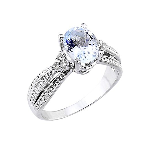 -. Binding : Jewelry -. Brand : Birthstone Engagement Rings -. Department : womens -. Feature : personalized, modern wedding proposal gemstone band for ladies individually hand-set with an oval-shaped aquamarine March birthstone center stone and 6 round-shaped natural white diamond side stones / exquisitely handcrafted with solid 14 karat white gold in impressive high polished finish / comes with free special gift packaging / made in the USA yet offered at factory direct jewelry P.R.Ice / ships directly from the manufacturer to the customers -. Label : Claddagh Gold -. Manufacturer : Claddagh Gold -. Model : QKE1047 -. MPN : QKE1047 -. PartNumber : QKE1047 -. ProductGroup : Jewelry -. ProductTypeName : FASHIONRING -. Publisher : Claddagh Gold -. Studio : Claddagh Gold -. Title : 14k White Gold Diamond Band Oval Aquamarine Engagement Ring