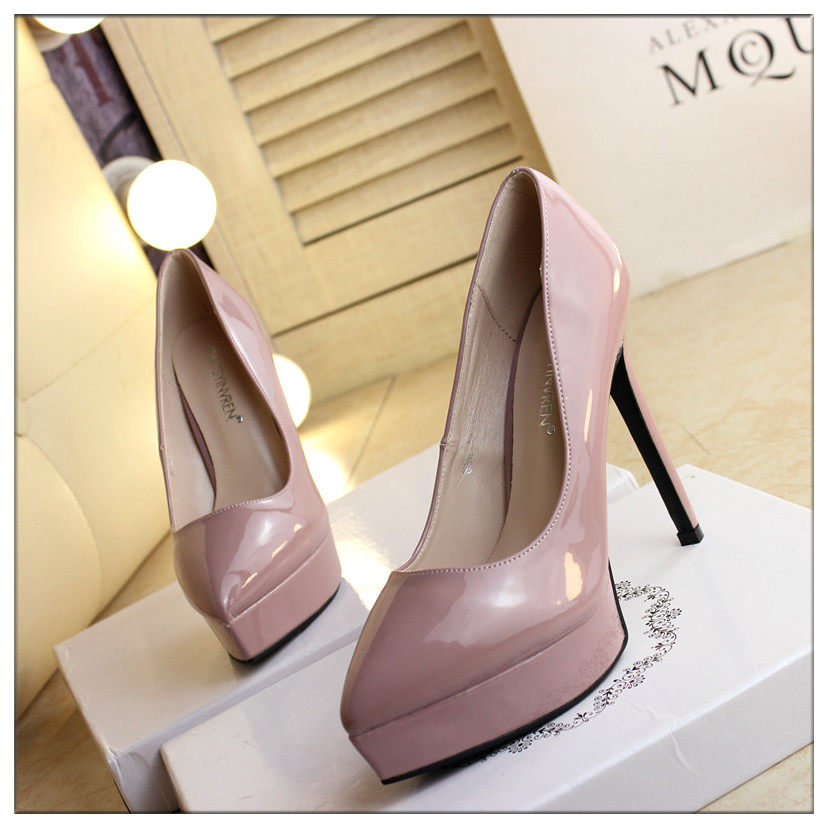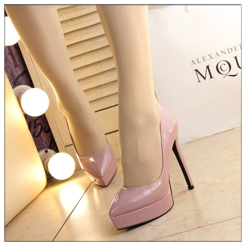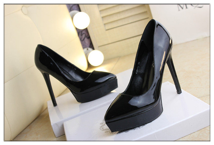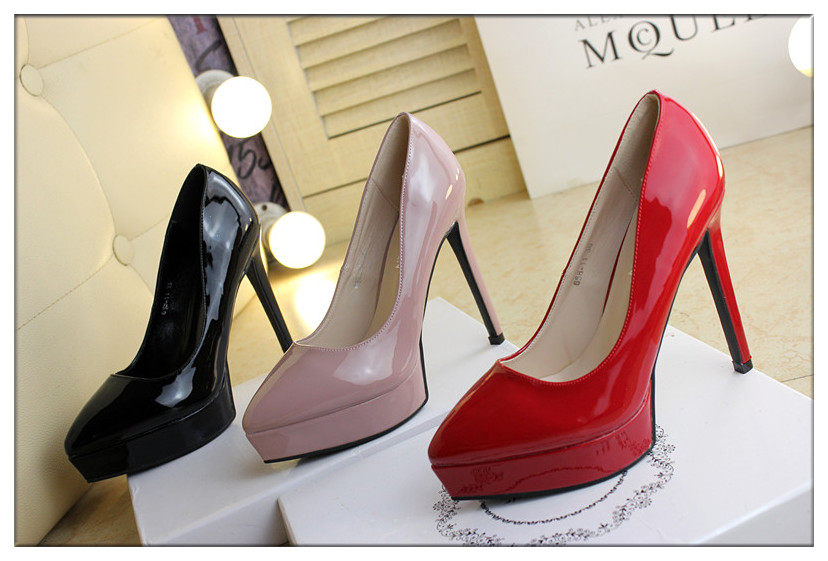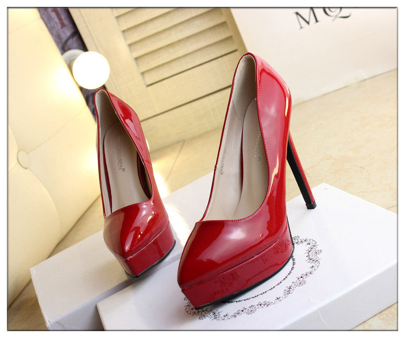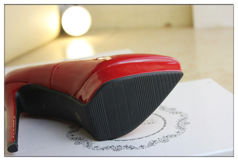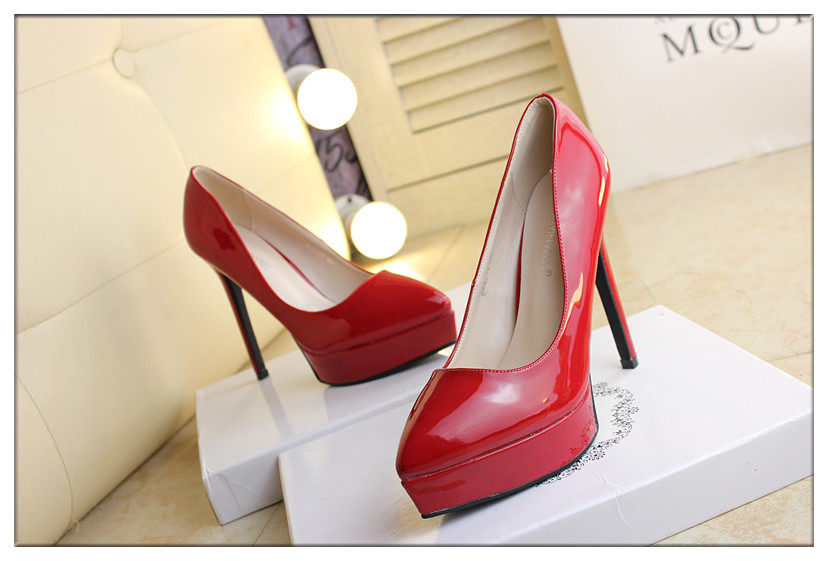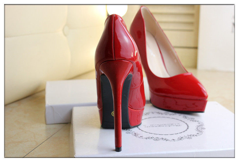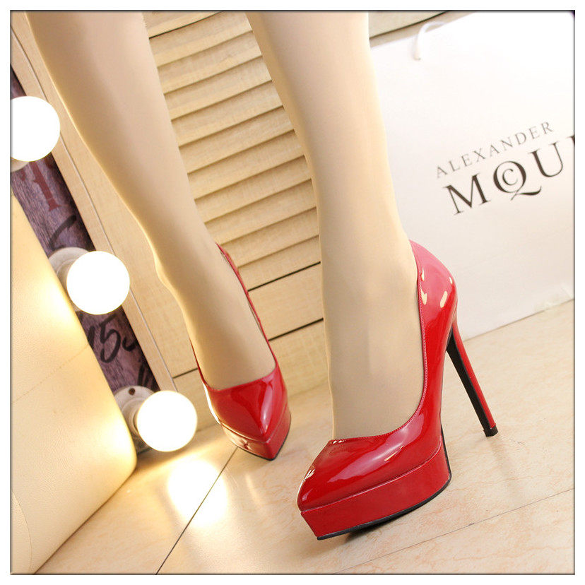 时尚漆皮尖头高跟鞋12cm细跟红色婚鞋防水台黑职业工作单鞋女秋款
