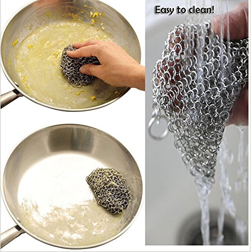 Will Not Scratch Your Pans. Keeps Your Cast Iron Seasoned,The Small Ring Scrubber does the job with just warm water, no need too hot. And the hand made chainmail design means that only the round ring edges touch the pan.