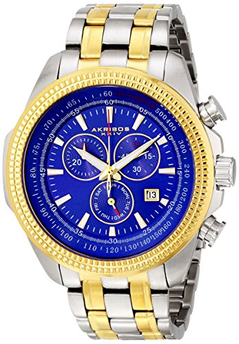 ReleaseDate : 2013-08-29 Studio : Akribos XXIV Publisher : Akribos XXIV Binding : Watch Product Description Stainless steel case with a two-tone (silver and gold-tone) stainless steel bracelet. Fixed coin edged gold-tone bezel. Blue sunray dial with luminous gold-tone hands and index hour markers. Minute markers. Tachymeter around the outer rim. Dial Type: Analog. Luminescent hands and markers. Date display at the 4 o'clock position. Chronograph - two sub-dials displaying: 60 second and 30 minute. Day of the week sub-dial at the 6 o'clock position. Quartz movement. Scratch resistant mineral crystal with sapphire coating. Pull / push crown. Screw down case back. Case diameter: 46 mm. Case thickness: 12 mm. Round case shape. Band width: 21 mm. Band length: 9 inches. Push-button deployment clasp. Water resistant at 100 meters / 330 feet. Functions: chronograph, date, hour, minute, second. Casual watch style. Akribos XXIV Conqueror Blue Dial Two-tone Stainless Steel Mens Watch AK617BK. 0