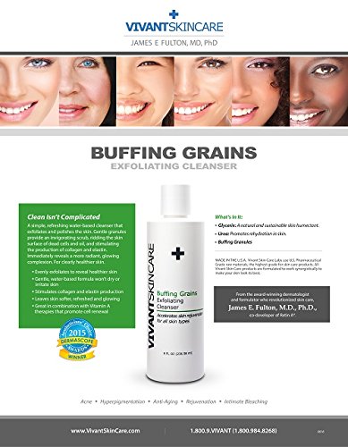 Vivant's Buffing Grains Exfoliating Cleanser can be used several times a week or daily for a refreshing facial scrub. Great for removing excessive dead skin and surface oils as part of your skin care regimen. Also rich in natural and sustainable Glycerin that locks moisture into the skin, keeping skin feeling smooth. MADE in THE U.S.A. Vivant Skin Care Labs use U.S. Pharmaceutical Grade raw materials, the highest grade for skin care products. All Vivant Skin Care products are formulated to work synergistically to make your skin look its best.Feature