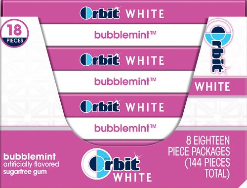 Orbit White Bubblemint is a sugar-free gum proven to help remove stains and whiten teeth when you chew two pieces after eating and drinking (Based on an 8-week clinical test).