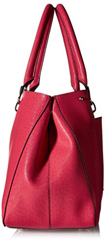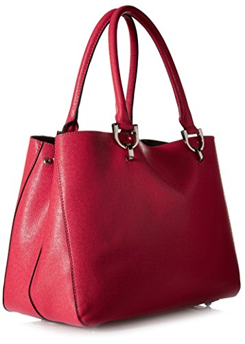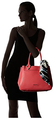 No closure. Dual rolled carry handles with decorative scarf. Exterior features brand detail at front and polished hardware. Flat base with protective metal feet. Two compartment, unlined interior flaunts center slip pocket.