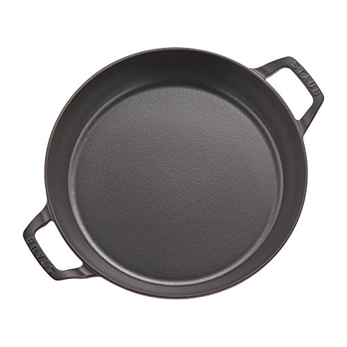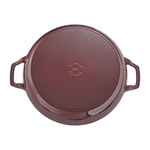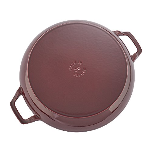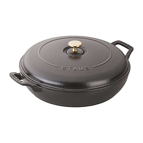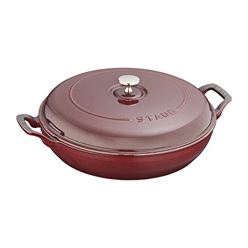 The Staub Cast Iron 3.5-qt Braiser is the perfect pot for one-dish suppers, braised lamb shanks, and breakfast hash. It will quickly become your go-to cooking vessel, perfect for sauteing, frying, braising, and roasting. Thanks to its vivid Majolica enameling - a three-step technique that imbues the color with brilliance and depth - this iconic piece beautifully transitions from oven to table.The domed lid makes it easy to cook large cuts of meat - its heavy weight helps lock in moisture for flavor-enhanced food. The braiser's unique design features vintage look handles that encourage easy maneuvering while wearing oven mitts.Feature