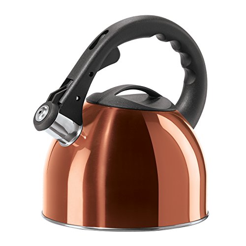 This stainless steel whistling tea kettle is the perfect addition to any modern kitchen stovetop. It's stay cool nylon handle and trigger opening spout allows for safe handling and a classic whistle sounds when water is boiling. Capacity: ( 2.5 LT. / 85 Oz. ). Available in stainless steel, red, and copper finishes.Feature