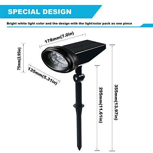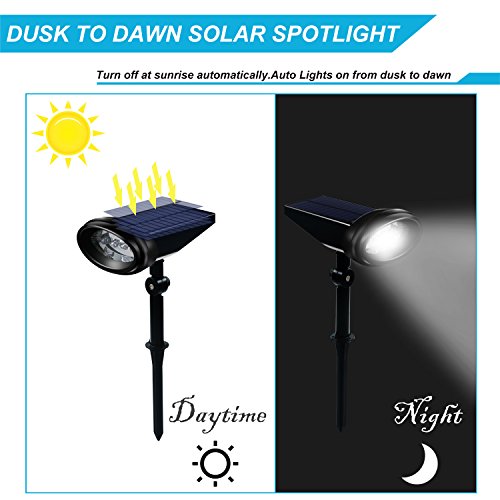 SUPER BRIGHT and AUTOMATIC:★The Solar landscape spotlights will turn on automatically which keep brightness lighting up for 3 hours,turn off at sunrise automatically.Auto Lights on from dusk to dawn.these LED solar spotlights give you peace mind and keep you from stumbling in the dark.