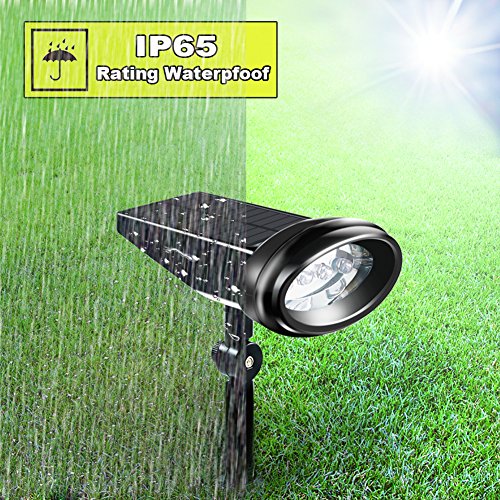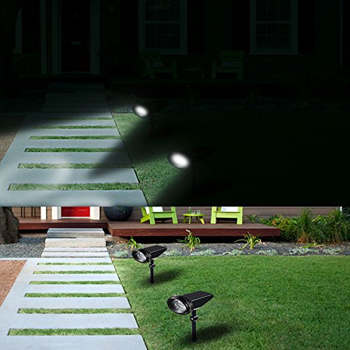 WEATHERPROOF AND SAVING ENERGY-★The Durable outdoor Solar spotlight can withstand harsh weather with IP65 waterproof ;★Upgrade bigger solar panel makes conversion rate of solar energy Powered by 2000mAh 3.7V lithium rechargeable battery. Up to 8-10 hours working time after fully charged