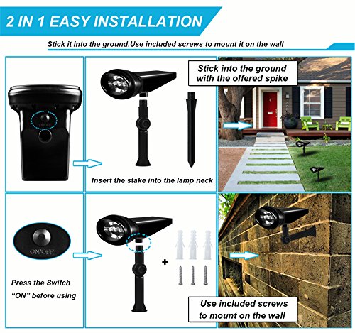2 in 1 EASY INSTALLATION - ★Stick the solar spotlight into the ground.★Use included screws to mount the solar light on the wall.