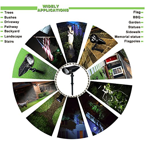 APPLICATIONS:These solar spotlights are suitable for driveways,pathways,sidewalks,BBQ,and other areas of your lawn, garden, patio,BBQ,etc. These solar outdoor spotlights are very bright which are ideal for illuminating the flag,memorial statue.