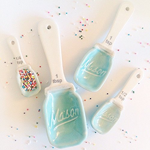 - This retro-chic, blue ceramic Measuring Spoon Set captures the look of vintage mason jars and is a great addition to your kitchen.