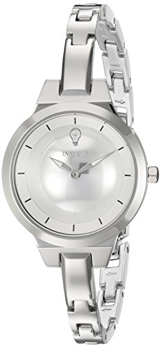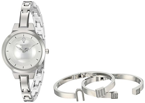 Invicta 23324 Gabrielle Union women's watch features a 28mm wide and 9mm thick solid stainless steel case with a fixed bezel and textured push-pull crown. Invicta 23324 is powered by Japanese TMI PC10 quartz movement. This beautiful watch also features a sharp looking shiny silver tone dial with white accents silver tone luminous hands and index hour markers, scratch resistant flame fusion crystal and water resistant to 100 meters. Invicta 23324 is equipped with an 8mm wide solid stainless steel bangle bracelet with a jewelry clasp. This watch also comes with two crystals accented solid stainless steel bangle bracelet. Invicta 23324 women's Gabrielle Union silver tone dial steel watch & bangle bracelet set is brand new and comes in an original Invicta gift box and is backed by a 5 year limited warranty.Feature