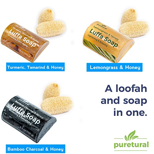 -. Title : Puretural Luffa Soap Gift Box Set of 3 x 100 Grams Includes 1x Turmeric & Tamarind, 1x Lemongrass and 1x Charcoal Loofah Soap Bar with Honey to clean dark spots for Stretch marks Whitening