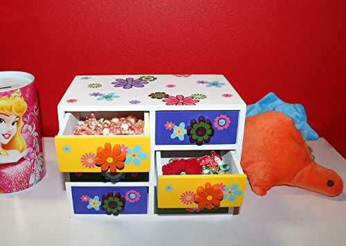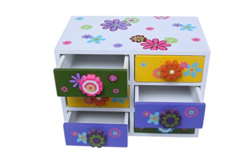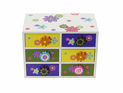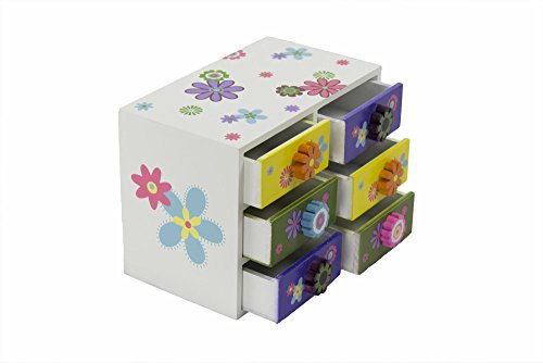 -. Binding : Office Product -. Brand : Juvale -. Color : white -. Department : girls -. EAN : 0096362212656 -. Feature : Constructed of sturdy wood this compartment chest is durable and has a beautiful paint finish / Put away your kids jewelry, hair supplies, or any other small accessory / The perfect gift for your little P.R.Incess on any occasion / The box comes with 6 drawers to store all your kids knick knacks / Dimensions: 8 x 4.5 x 5.5 inches -. IsAdultProduct : 0 -. Label : Juvale -. Manufacturer : Juvale -. PackageQuantity : 1 -. ProductGroup : Toy -. ProductTypeName : TOYS_AND_GAMES -. Publisher : Juvale -. Studio : Juvale -. Title : Wooden Jewelry Box / Kids Jewelry Box - 6 Drawer Colorful Flower Jewelry Box Case For Necklaces, Rings, Bracelets - 8 x 4.5 x 5.5 Inches -. UPC : 096362212656