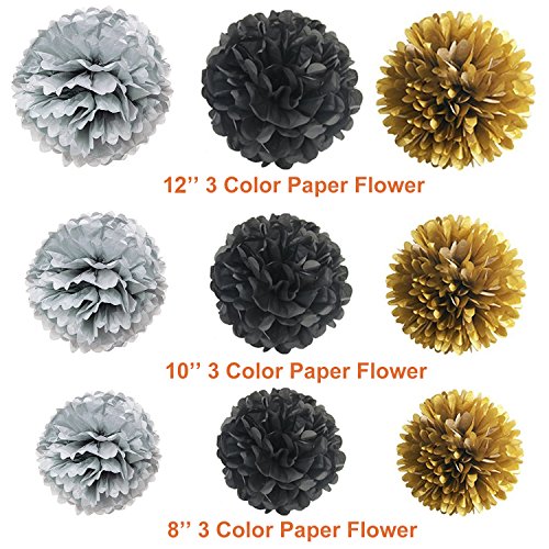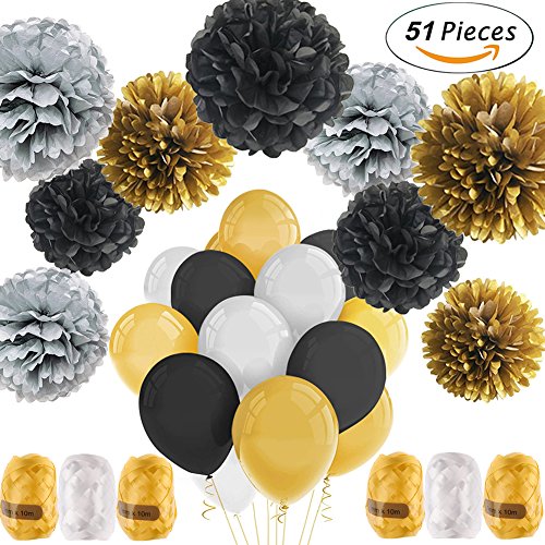 Newland Party Decorations, 51 pcs Kits, Pom Poms Flowers, Latex Balloons, Colorful Ribbons Kit, For Wedding Birthday Party Festival Decorations (Black Silver Gold)