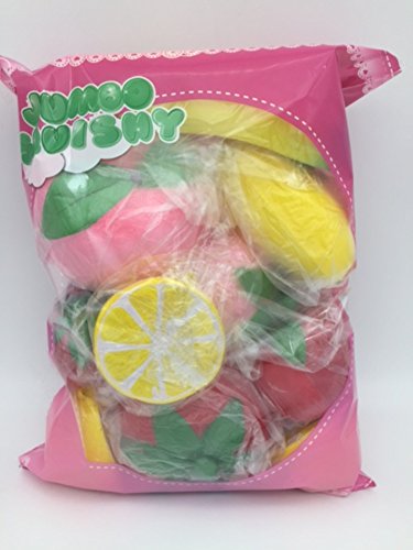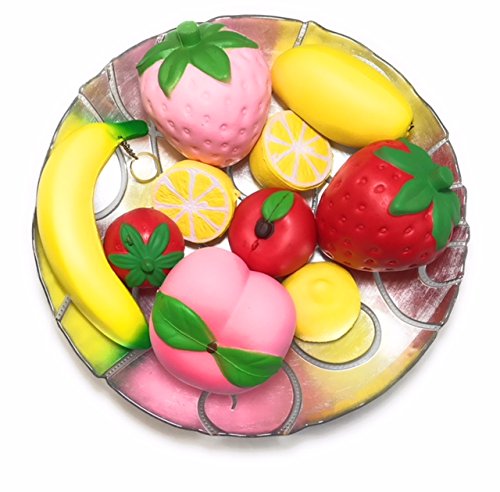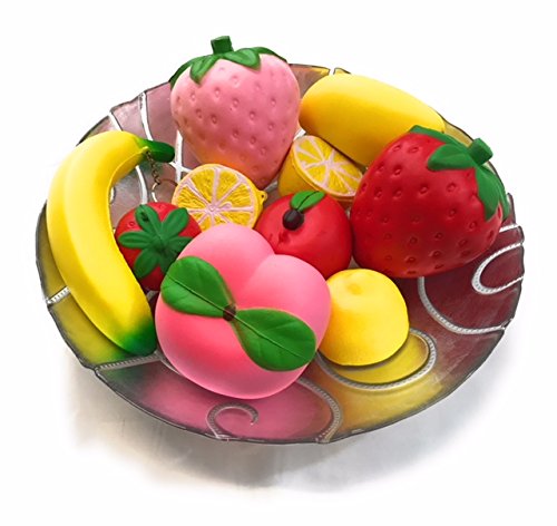 Included in this GP jumbo squishy 10pcs pack are 10 fruit squishies Strawberry, Banana, Peach, Lemon, Apple, and Mango some duplicates of different sizes and colors. All of the 10pcs in this bag are super soft and slow rising. All of these 10pcs are made from environmentally safe Polyurethane foam that is very durable and super soft. These squishies make great stress relief toys for both kids and adults alike. Our GP jumbo squishy 10pcs also makes a great gift and also good for party favors and much more. Our pack is also a great deal with 4 more fruits then are competitors 6 pcs set. All of our squishies are high quality and super soft making them great for any task you put them to.Feature