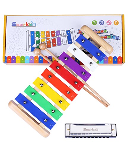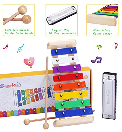 -. Feature : ✅ACCURATELY TUNED MUSICAL INSTRUMENTS - 8 metal keys of this wooden xylophone are made of high quality aluminum alloy and steel alloy which create an clear tunes. Every key is fixed on base stably, won't fall off or slide randomly. High quality with excellent craftsmanship, smooth wood and keys, won't scratching hands at all. Durable and exquisite / ✅UNIQUE SAFE ROUND RONNER - 4 corners of smarkids xylophone wooden toys are specially developed for kids. It has smooth round shapes which are special designed for more protection, providing higher safety than other brands with sharp corner / ✅CHILD SAFE WODDEN MALLETS - our xylophone mallet are longer and thicker handle than normal small thin mallets, it works better for little hands. Easy to hold, safe for ages 5 years and up. Perfect for percussion, produce accurate clear louder sound C-key music / ✅FREE STAINLESS STEEL HARMONICA - high quality harmonica set with individual storage case. It's a classic musical instruments of 10 holes 20 tones which is easy and fun for even little kids to play. Solid, durable and stainless. Best educational learning toys for toddlers / ✅MONEY BACK GUARANTEE - come with gift box, provide user manual with 2 popular practice songs, and easy instructions. Provide 2 month money back guarantee if you're not 100% satisfied