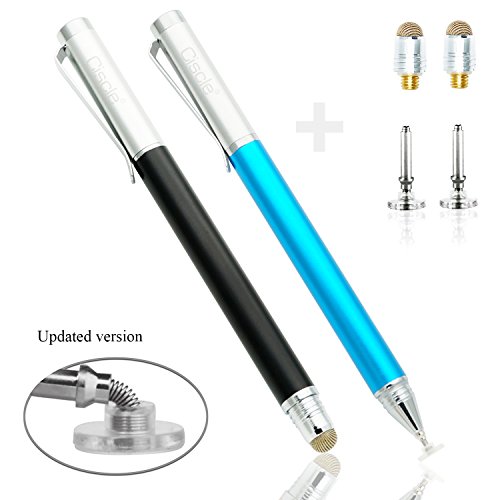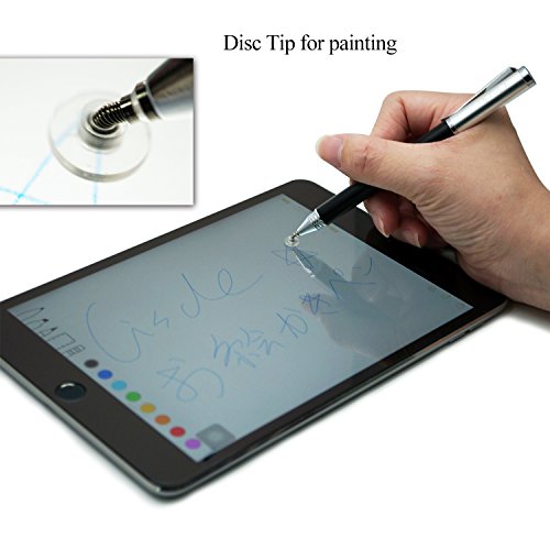 【About the Stylus】Fiber and Disc 2 in1 stylus pen. Fiber tips are suitable for clicking and browsing and the disc tips are good for drawing and painting. The stylus is made of solid aluminum. Fashion design and strong body with appropriate weight make you feel more balanced and substantial when you are writing or drawing. Package including: 2 x 2-in-1 Fiber and Disc Stylus; 2 x replaceable fiber stylus tips; 2 x replaceable Disc stylus tip.
