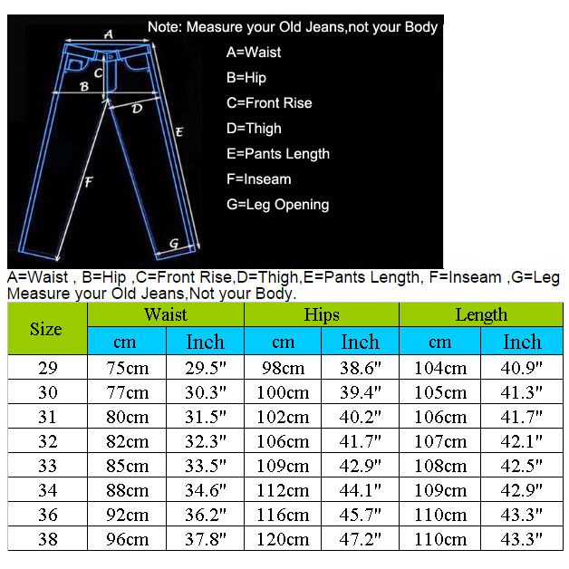 A=Waist , B=Hip ,C=Front Rise,D=Thigh,E=Pants Length, F=Inseam ,G=Leg Opening