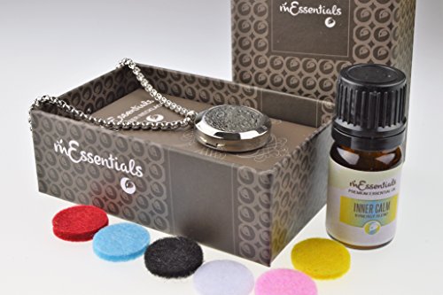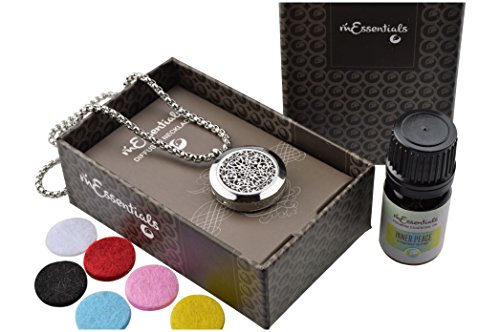 UNIQUE - aromatherapy Essential oils and Diffuser Necklace Gift set for you or to give as a gift. Combines beautifully crafted Diffuser necklace with one 5 ml bottles of 100% pure therapeutic grade essential oils, and 5 refill pads packaged in a finely crafted gift box.