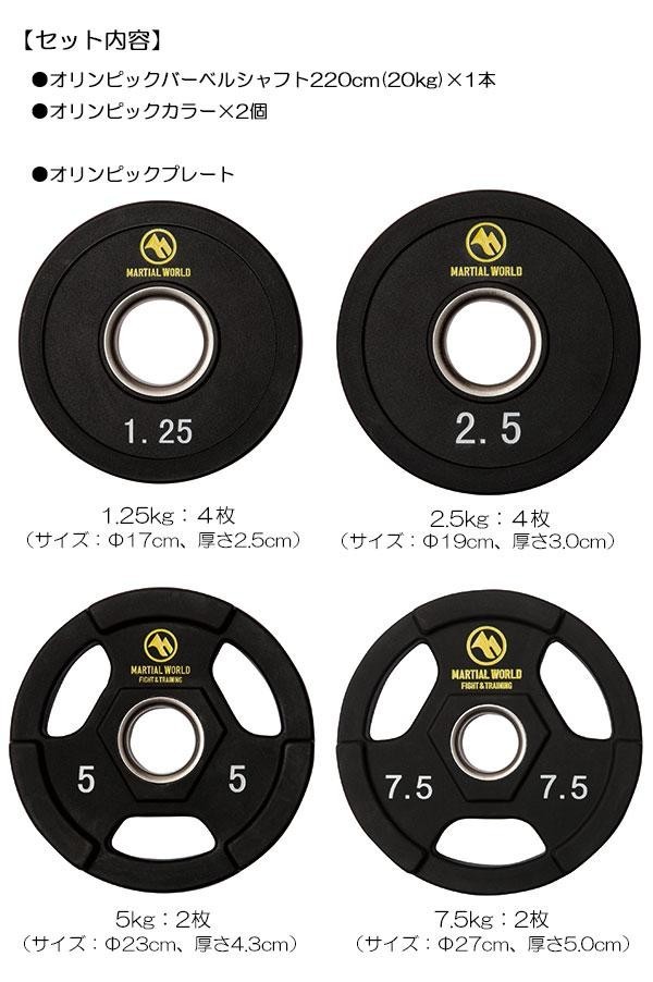 | セット内容 | オリンピックバーベルシャフト220cm(20kg)×1本、オリンピックプレート(1.25kg×4枚・2.5kg×4枚・5kg×2枚・7.5kg×2枚)、オリンピックカラー×2個 |