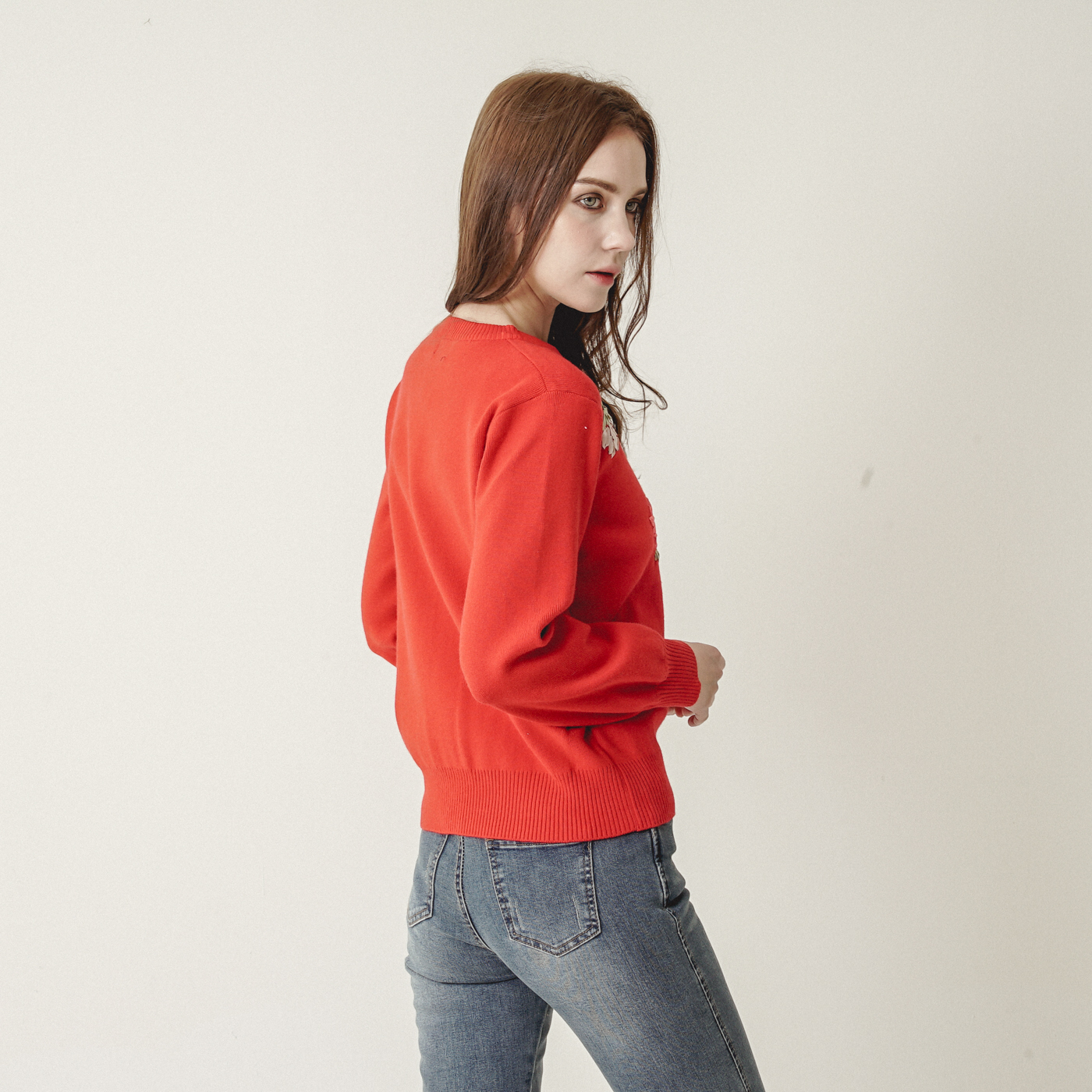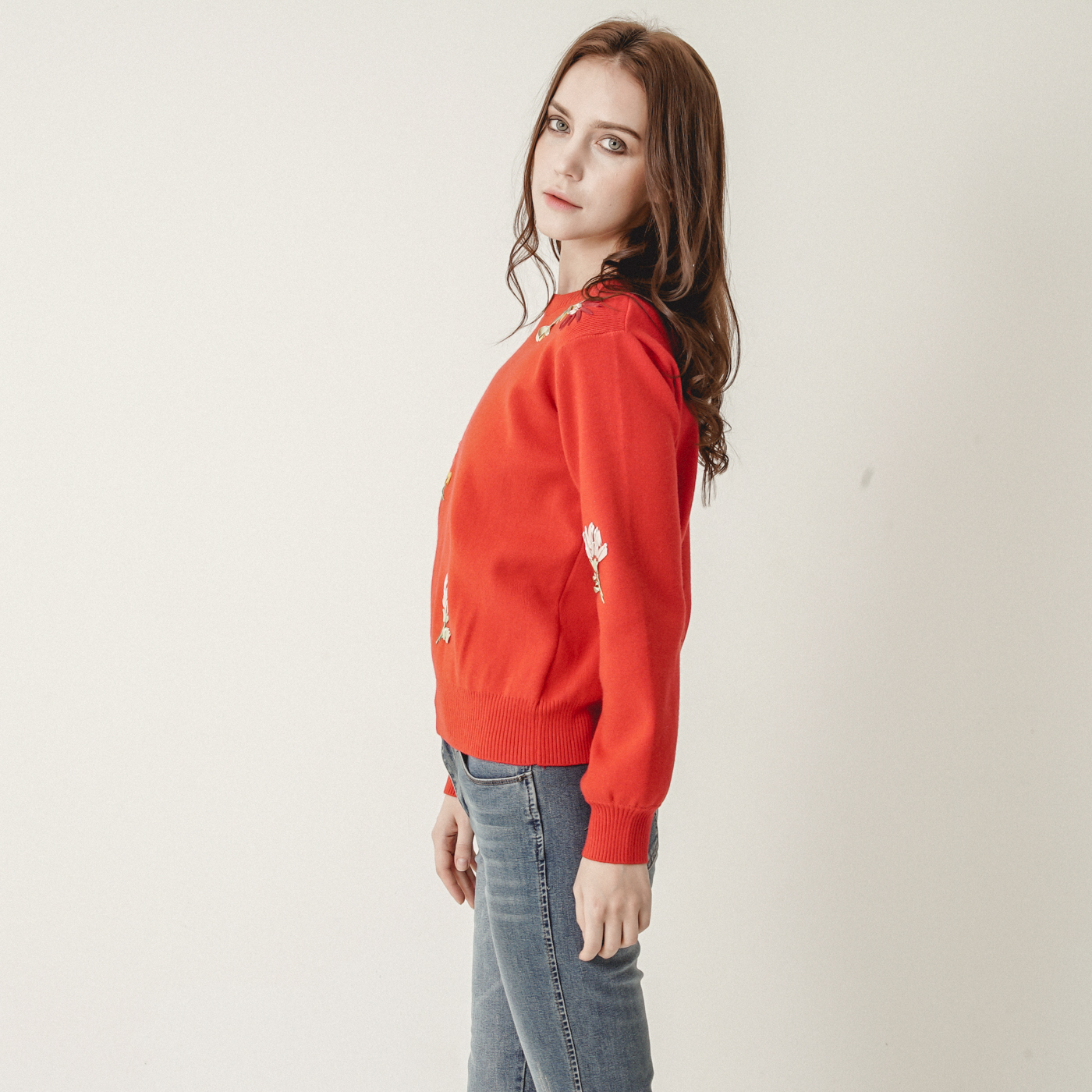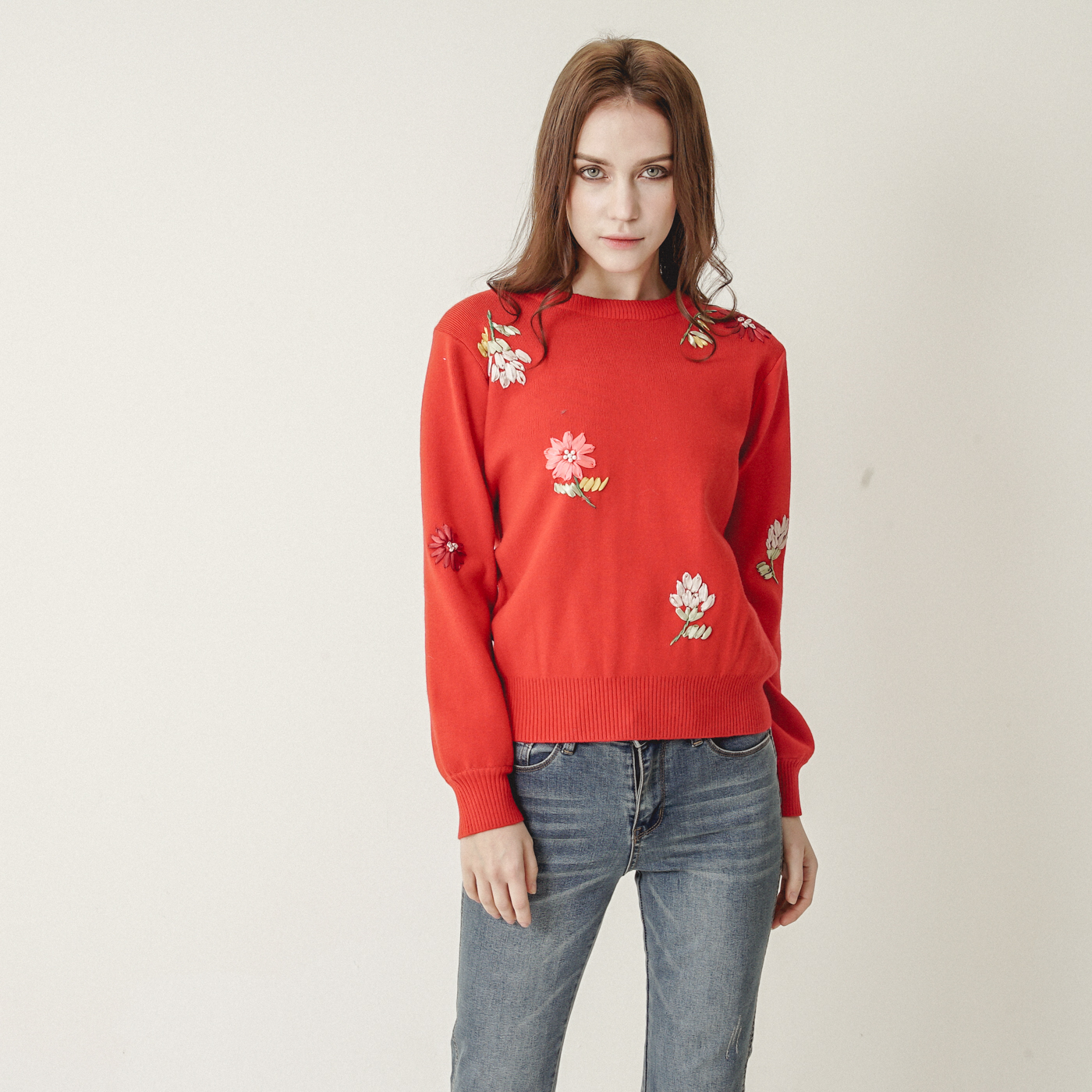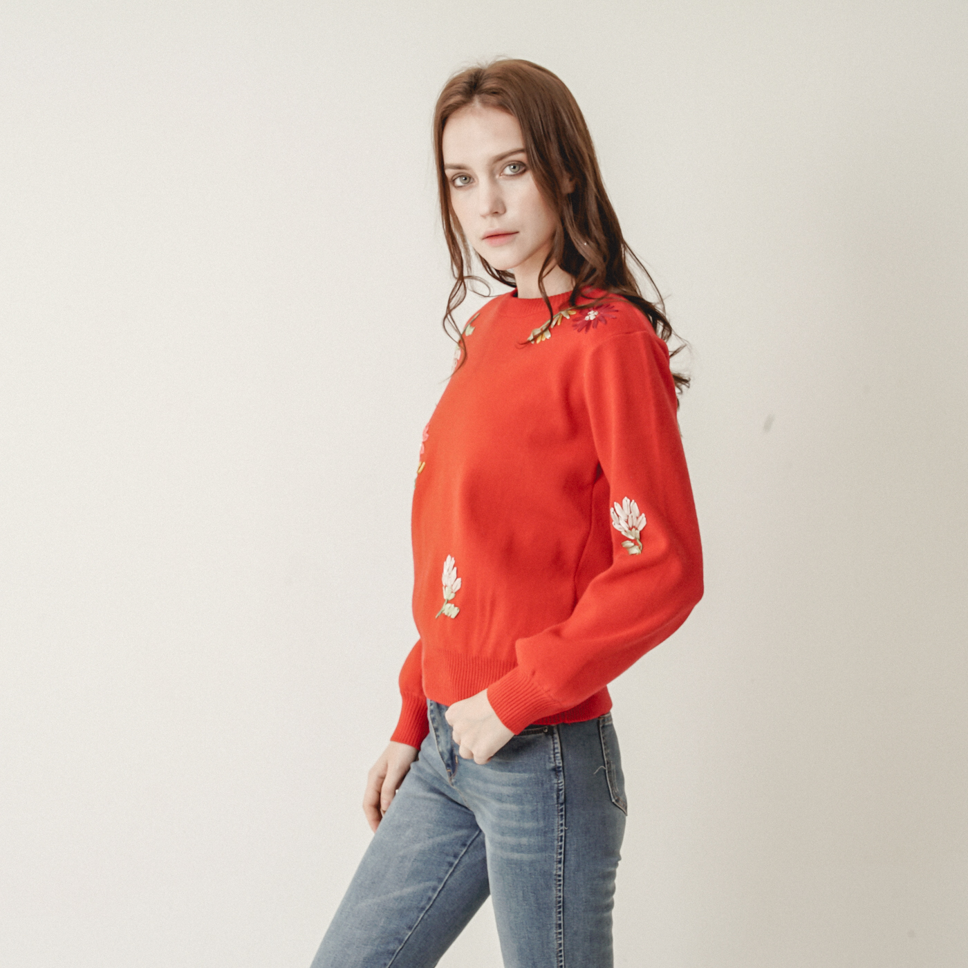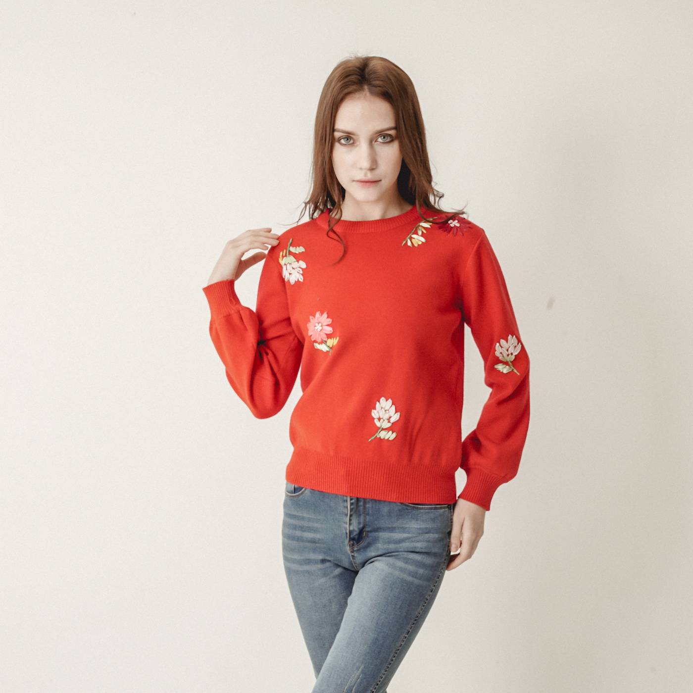 입체적 꽃자수가 아름다운 정열적인 니트탑입니다.