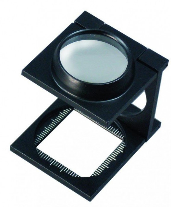 | 視界周辺部に歪みを改善するために用いる2枚のレンズを用いるルーペです。色収差は残ります。置いて見ることができるので印刷関係や自然観察にも利用できます。目盛りがあるので便利です。 |