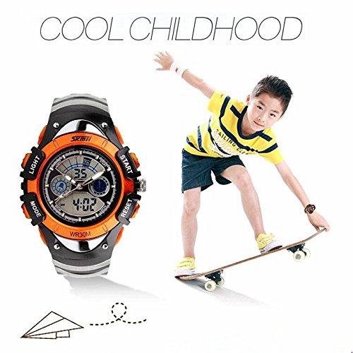 -. Feature : Quartz movement with analog and digital display, helps children to read watches correctly; / Kids sport watch featuring backlight, 1/100 second stopwatch with split function, daily alarm, chime hourly and time/week/date display; / 38 mm resin case with acrylic dial window and luminous hands on dial, easy to read at nights; / Soft silicone band with buckle closure, very comfortable to wear; / Water resistant to 50 m, suitable for swimming, white-water rafting, non-snorkeling water related work and fishing, NOT suitable for diving. Please do not press any button underwater